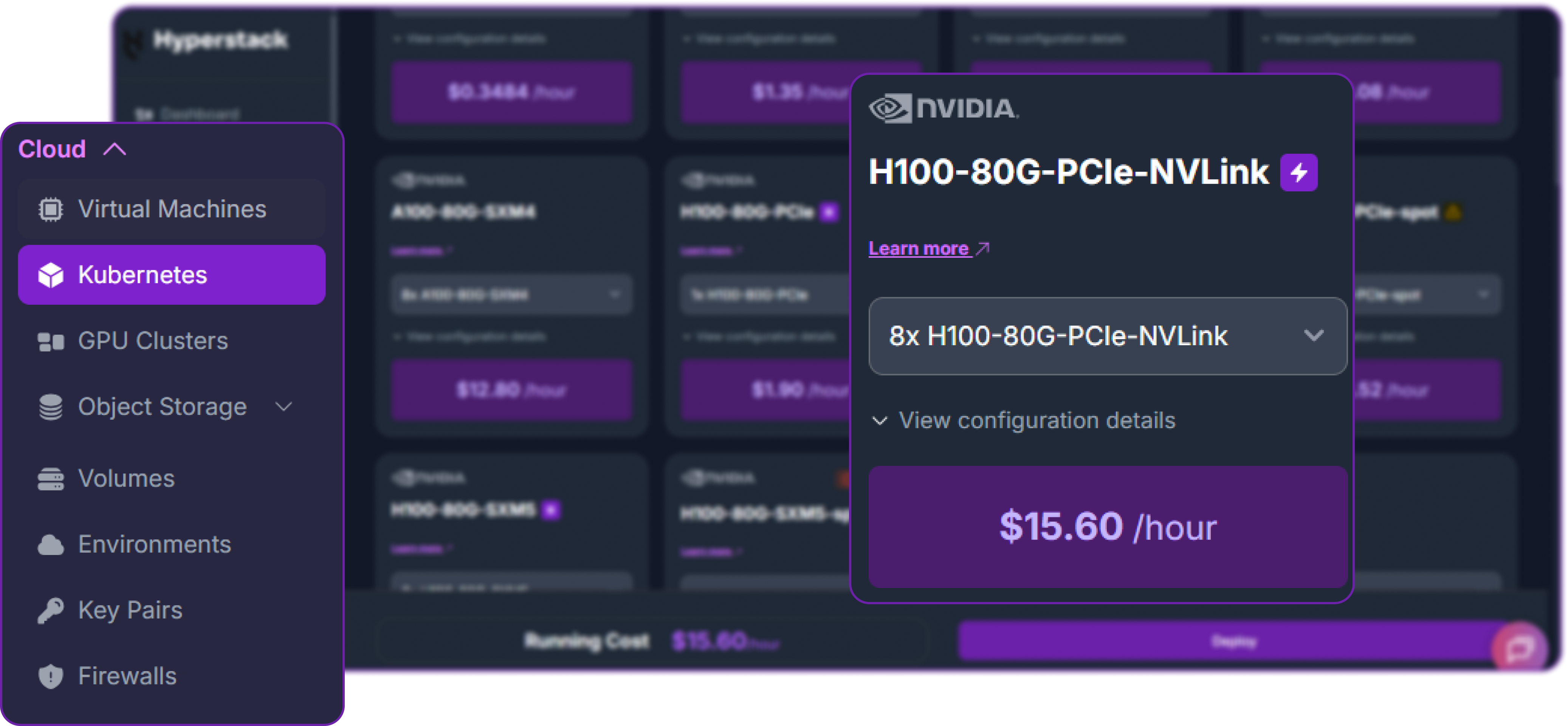 - Worker Flavour: Scroll down to the worker node group and select 8x H100-80G-PCIe-NVLink at $15.60/hr per node. With two worker nodes that brings the total compute cost to roughly $31.20/hr. You'll see this card highlighted in purple in the flavour grid.