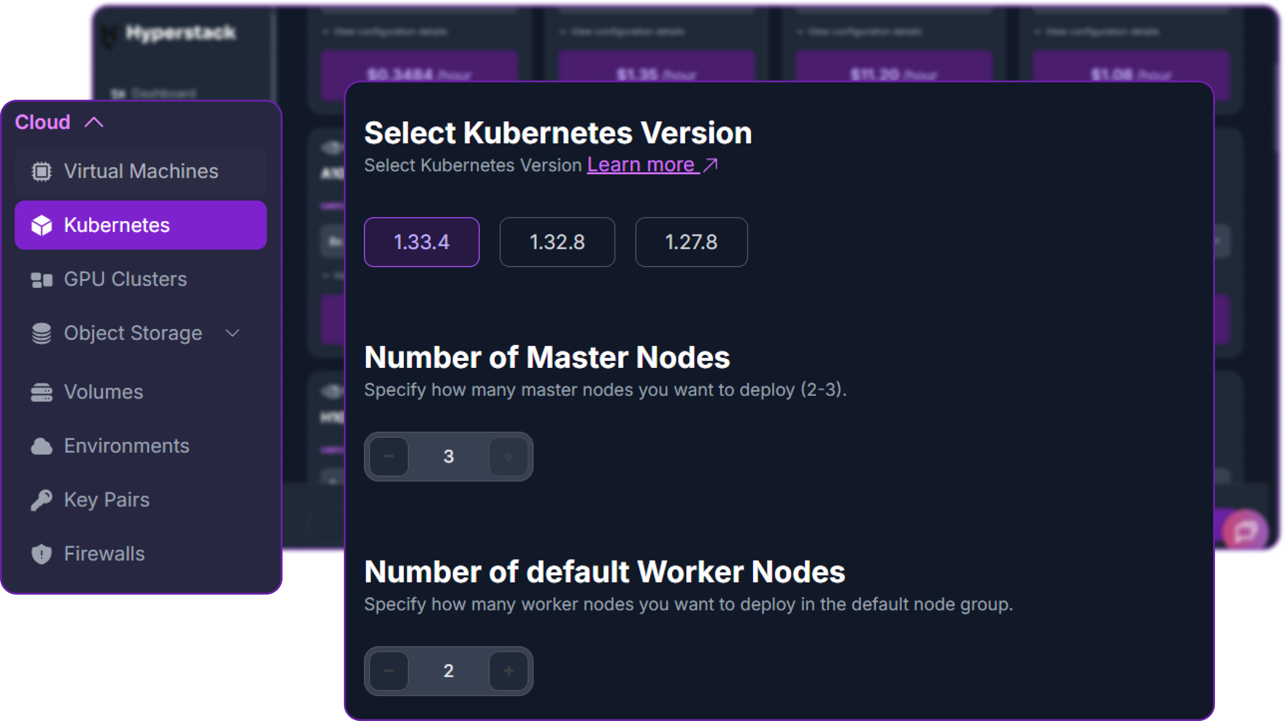 From the Hyperstack dashboard, navigate to the Kubernetes section in the sidebar and create a new cluster. The cluster topology is non-negotiable: V4-Pro needs both worker nodes to come up successfully.